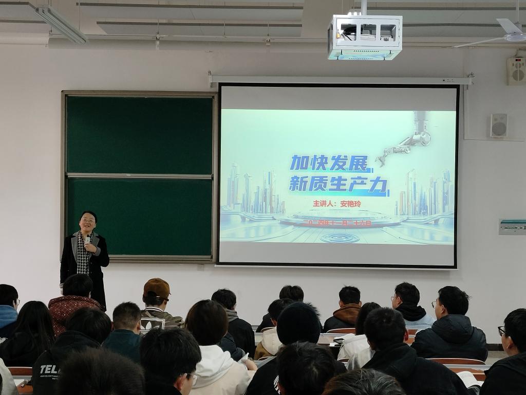 课堂上,安艳玲以AI的应用引出本次授课主题——加快发展新质生产力。她从物质及精神方面向同学们解释什么是生产力、新质生产力的概念、新质生产力发展的背景等内容,多维度深入阐释了新质生产力的内涵及重要性。通过生动案例与详实数据,向同学们展示了新质生产力在推动交通行业变革中的关键作用。她强调要遵循科技创新和产业发展的规律,因地制宜发展新质生产力并鼓励同学们要勇于创新,扎实掌握专业知识,为交通工程领域新质生产力的发展贡献力量。