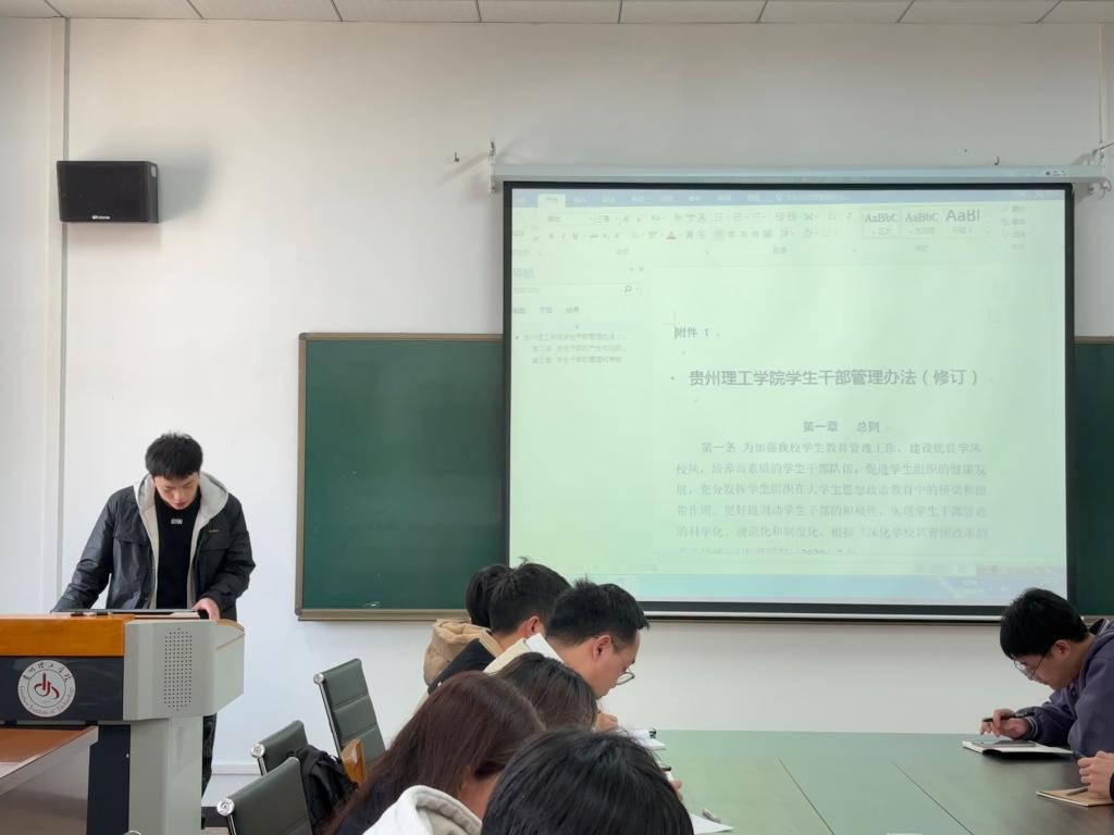 在培训过程中,陈路瑶首先带领同学们学习了《贵州理工学院学生干部管理办法(修订)》,重要讲解了学生干部的产生任职条件、管理与考核以及学生干部的权利与义务等方面内容。接下来学习了《中国足球彩票推动高校学生会(研究生会)深化改革的若干意见》,强调学生会应从明确职能定位、改革运行机制、坚持精简原则、明确遴选条件等十方面参照执行管理学生会。最后对《学生会、研究生会干部自律公约》进行学习,期望各学生干部严于律己、恪守学生本分,扎扎实实做事。