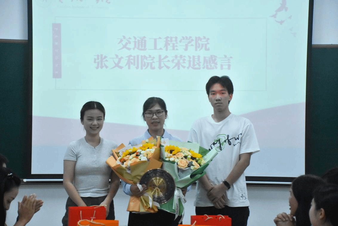 座谈会后,活动进入第二阶段 —— 张文利院长荣退仪式。仪式以一段学院精心制作的致敬视频拉开帷幕,视频中回顾了张文利院长在学院任职期间,推动学科建设、深化教学改革、关怀师生成长的点点滴滴,一幕幕珍贵画面,让在场师生深切感受到她对学院发展的深厚情怀与卓越贡献。随后,张文利院长发表荣退感言。她动情回顾了自己与同事们并肩奋斗、与同学们共同成长的难忘经历。她衷心感谢学校、学院提供的广阔平台,感谢历届领导的信任支持、全体同仁的携手相助,以及一届届学生带来的青春活力。“交通工程学院是我挥洒热血、寄托深情的地方,见证学院从起步到发展、从壮大到突破,是我人生中最宝贵的财富。” 张文利院长表示,退休后将继续心系学院,一如既往地关心、支持学院各项事业发展,同时衷心祝福学院未来更加辉煌,祝愿全体师生前程似锦、万事顺意。