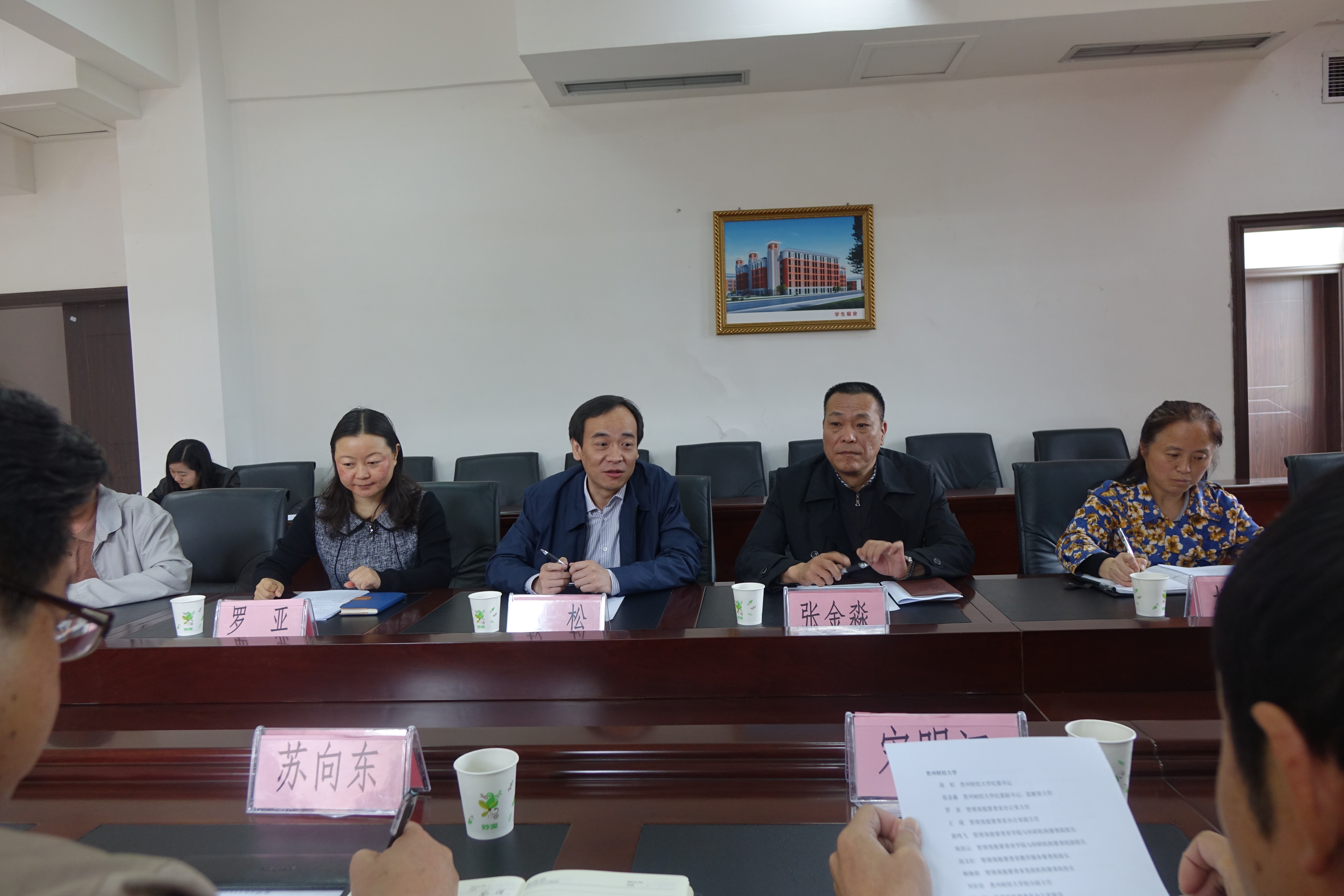 4月19日上午10:00,校党委委员、纪委书记苏向东、纪委副书记、监察室主任张妤、监察室副主任宋明江、组织部副部长卢文雄、校党政办副主任杨再豪、人事处副处长徐焱等一行9人赴贵州财经大学交流学习。