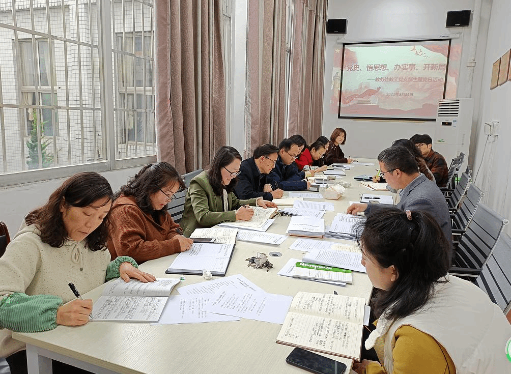 本网讯(教务处 罗敏)为坚定理想信念,牢记初心使命,丰富党史学习形式,2021年3月26日,教务处教工党支部在党员活动室开展“学党史、悟思想、办实事、开新局”主题党日活动。教务处教工党支部全体党员参加,主题党日活动由党支部书记顾亚丽主持。