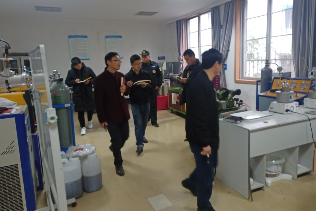 检查组在查阅资料基础上,实地走访了学校涉化类化学工程学院、食品药品制造工程学院、资源与环境工程学院、材料与能源工程学院四个学院教学(含服务科研)实验室。对各教学单位实验室安全应急管理相关制度、安全培训、教育与准落实情况;实验室危险化学品等危险源管理;实验室安全设施与个人防护配保障体系建设等问题开展了检查,对实验室、药品室、耗材室、储物间、防爆柜、消防设备设施、应急管理制度、应急包、危废处理等重点部位、重点环节进行了重点检查。