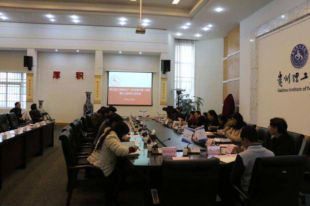 11月30日下午,贵州理工学院2017-2018学年第一学期第三次教学工作例会在喀斯特会议厅召开,副校长梁杰出席会议,各学院、教学部(中心)院长(主任、部长)、分管教学工作的副院长(副主任、副部长)、教学秘书,教务处、后勤处、教师工作处、评估中心、创新创业中心、网络中心负责人及教务处相关人员参加会议。会议由教务处处长邵芳主持。