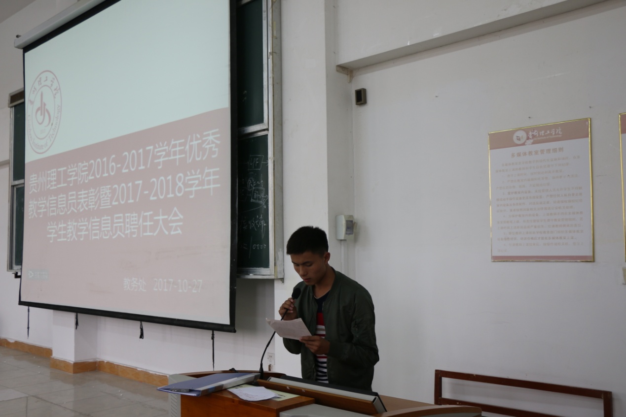 本网讯(教务处周新国)10月27日中午,贵州理工学院2016-2017学年优秀教学信息员表彰暨2017-2018学年学生教学信息员聘任大会在三教415举行。副校长梁杰出席会议并讲话,教务处处长邵芳、学工部副部长蒋文韬、教务处相关科室负责人及老师、2017-2018学年新任学生教学信息员及2016-2017学年优秀教学信息员参加了大会。会议由教务处副处长邓莲丽主持。