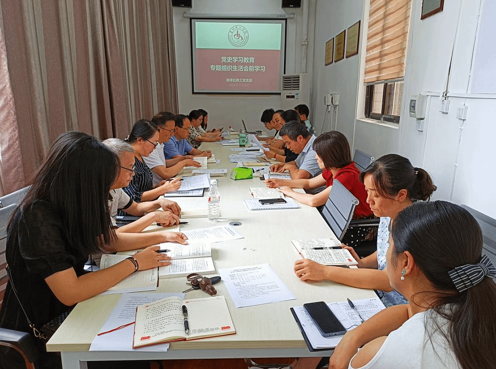 本网讯(教务处 舒群威)为高质量开展党史学习教育专题组织生活会,2021年7月15日,教务处教师党支部全体党员同志在党员活动室开展党史学习教育专题组织生活会会前学习。会前学习由党支部书记顾亚丽主持。