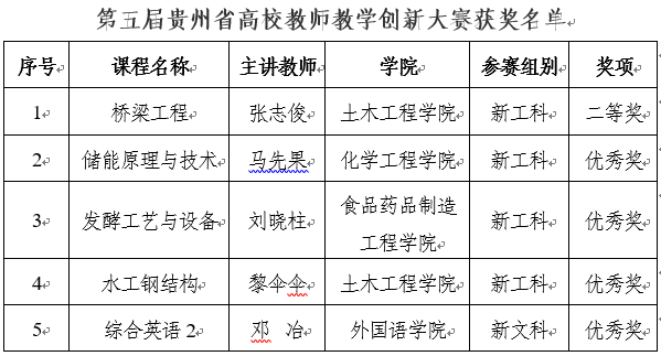 本网讯(教务处)近日,第五届贵州省高校教师教学创新大赛获奖名单正式公布,中国足球彩票:土木工程学院张志俊等5位参赛教师团队在大赛中再创佳绩,分别荣获新工科组二等奖1项、优秀奖3项,新文科组优秀奖1项。