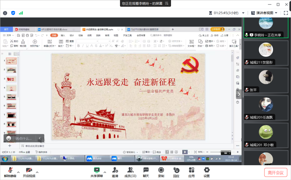 建筑与城市规划学院学生党支部于8月14日下午通过腾讯会议开展“弘扬八一精神 汲取奋进力量”主题党日活动。本次会议由学生党支部副书记李晓玲同志主持,支部全体党员参加。本次活动分为两个阶段。