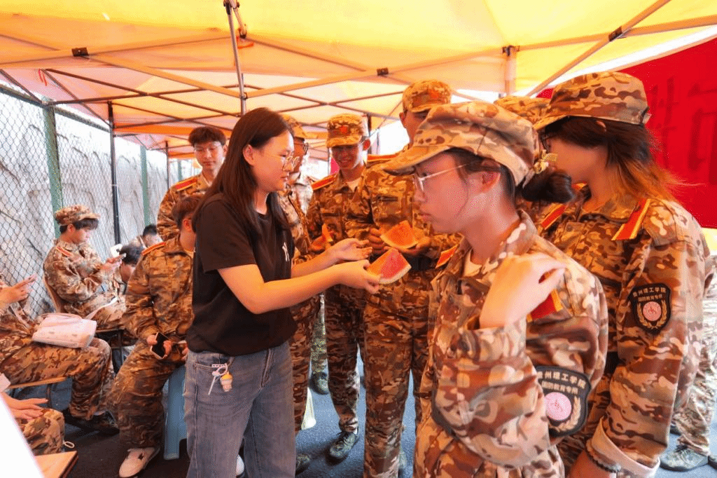 2024年9月5日,学院党总支书记袁小松、院长黄娅及各位辅导员班主任老师,以及学生会的代表们前往训练场地,为同学们送上了清凉解暑的西瓜和润喉糖,袁书记和黄院长在军训现场勉励大家克服困难,不怕艰险,努力完成军训各项任务。学院的关怀和支持,不仅为同学们带来了物质上的慰问,更在精神上给予了极大的鼓舞,使同学们在艰苦的训练中感受到了家的温暖。