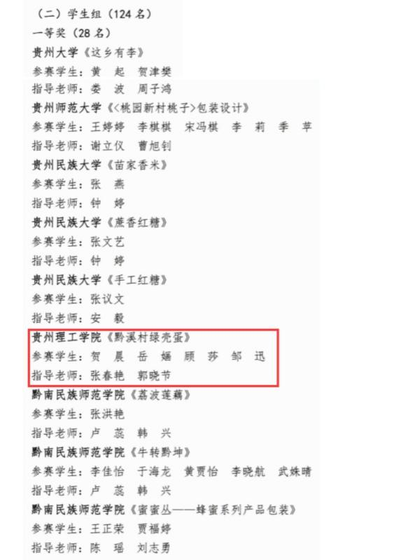 在此次活动月比赛中,我院张春艳、郭晓节老师指导学生参加了“青春黔行 黔货出山”农产品品牌包装设计大赛,学生作品《黔溪村绿壳蛋》获一等奖1名,《云谟紫茶》《瑶古村落——瑶浴包》获三等奖共2名。