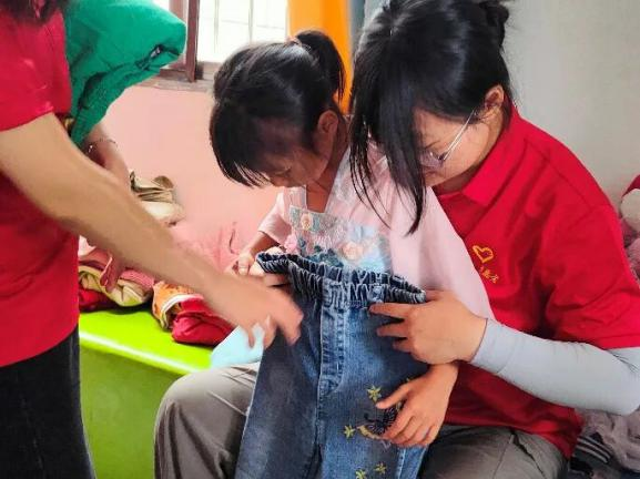 最后,映学团队为乡村孩子分发爱心人士捐赠的学习用品和衣物,耐心地为每个孩子选择合适的衣物。