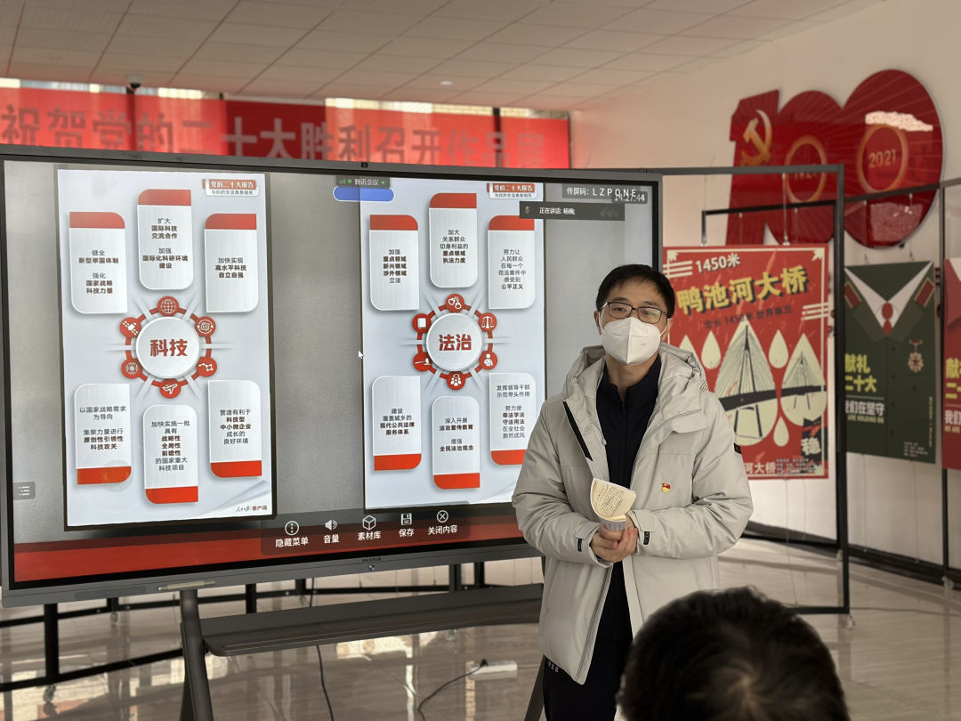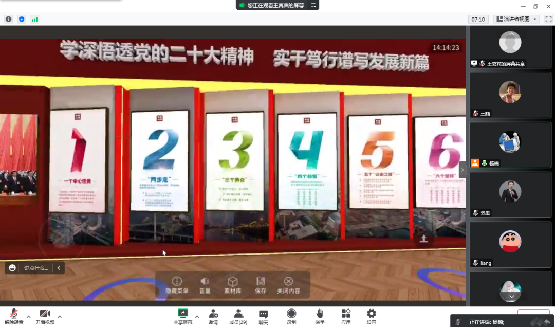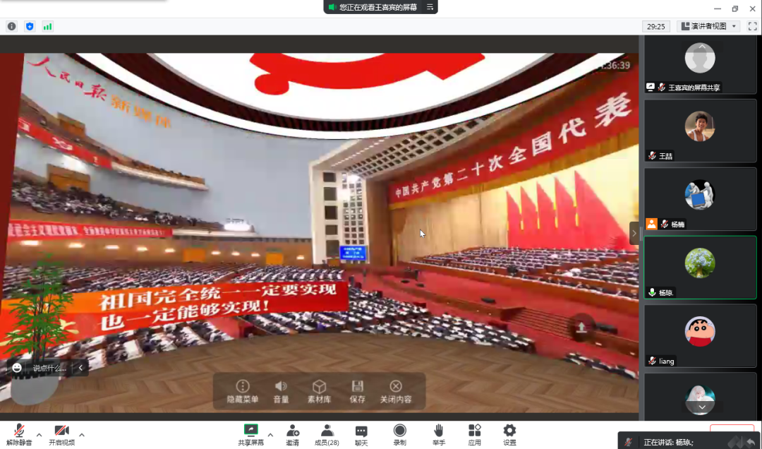 两个支部的参会党员通过“元宇宙”应用平台集体收看了《二十大代表风采录》,大数据学院教师党支部书记杨楠、建规学院教师党支部书记颜政纲分别借助“元宇宙”应用平台,以“学深悟透党的二十大精神 实干笃行谱写发展新篇章”“党的二十大报告与你的生活息息相关”为主题,给参会党员上专题党课。