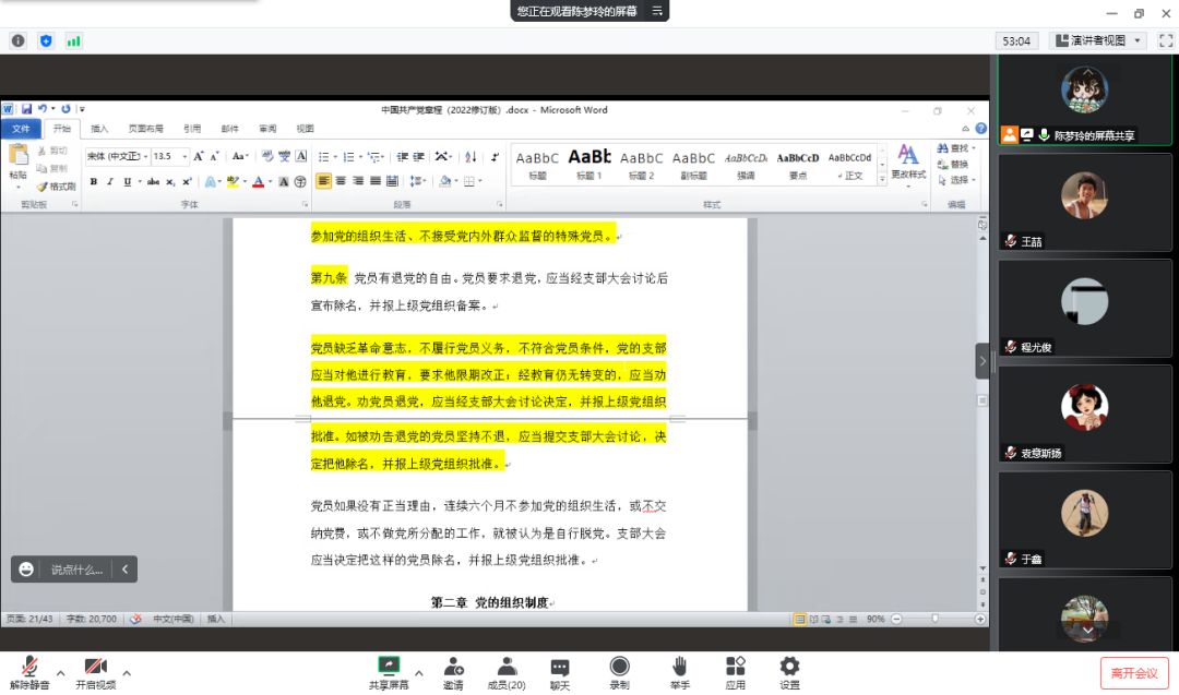 陈梦玲同志领学了新修改的《中国共产党章程》第一章部分内容,重点介绍了增强“四个意识”、坚定“四个自信”、做到“两个维护”,认真学习党的基本知识和党的历史,以及党员的基本权利和义务等新加入党章的表述部分。