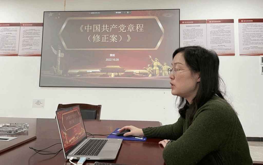 会上,学院党总支副书记黄娅以“中国共产党章程(修正案)”为题为全体党员上党课,详细介绍了党的二十大通过的党章修正案的具体内容,并强调作为一名党员应该认真学习党的历史,深刻领会党的二十大精神,深刻领会“两个确立”的决定性意义,增强“四个意识”、坚定“四个自信”、做到“两个维护”,更加自觉地学习党章、遵守党章、贯彻党章、维护党章,为全面建设社会主义现代化国家、全面推进中华民族伟大复兴而团结奋斗!