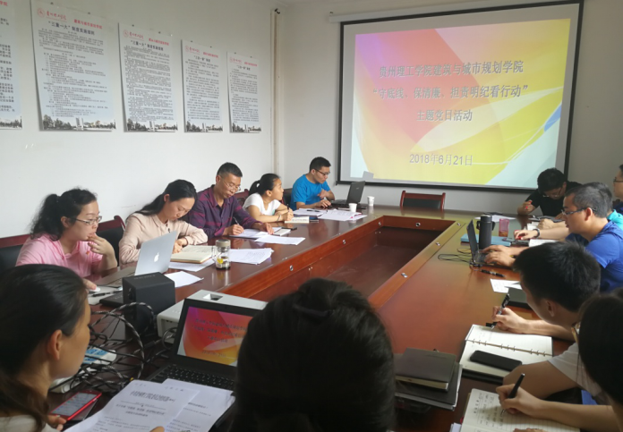 本网讯(建规学院 颜政纲)6月21日下午,建筑与城市规划学院全体教职员工齐聚学院会议室,开展“守底线、保清廉、担责明纪看行动”主题党日活动。我院学生入党积极分子和发展对象列席会议。