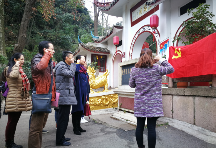 在麒麟洞“爱国主义教育基地”大门口,全体党员面对党旗,重温入党誓词。大家庄重严肃、誓词铿锵有力,宣示了学院领导班子和普通党员的坚定政治信念。