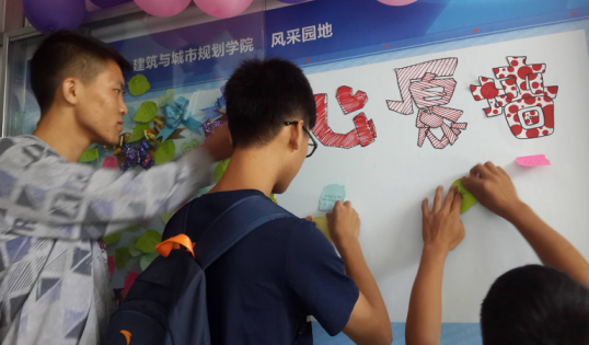 集中入学教育结束后,新生参观学院,在心愿墙上留下了自己的祝福和期望,并合影留念。