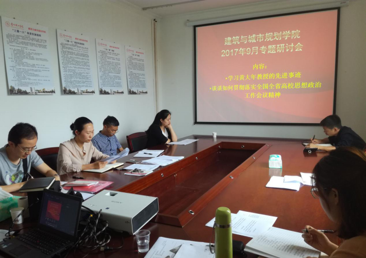 本网讯(建规学院 颜政纲)9月22日下午,建规学院教工党支部组织召开“两学一做”专题研讨会,全体教师党员围绕学习黄大年教授先进事迹、贯彻落实全国全省高校思想政治工作会议精神交流感想体会。院党总支书记张艳、院长刘恒参加会议。