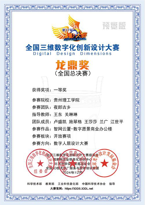 卢盛凯、施翠格、王莎莎、兰广和江世平等团队成员,在建规学院指导教师王东、关琳琳的精心指导下,经过充分准备,他们的作品《智网云厦-数字愿景商业办公楼》聚焦于商业办公楼的数字化转型,通过三维数字化技术,展现了未来商业办公楼的智能化和绿色化发展趋势,不仅展现了数字化技术在建筑设计中的应用,还体现了对传统文化的现代诠释和创新,设计将科技与文化完美融合。该不仅为学校赢得了荣誉,也为贵州省乃至全国的科技创新事业注入了新的活力。