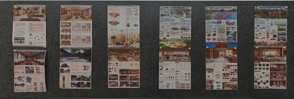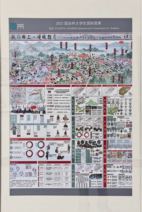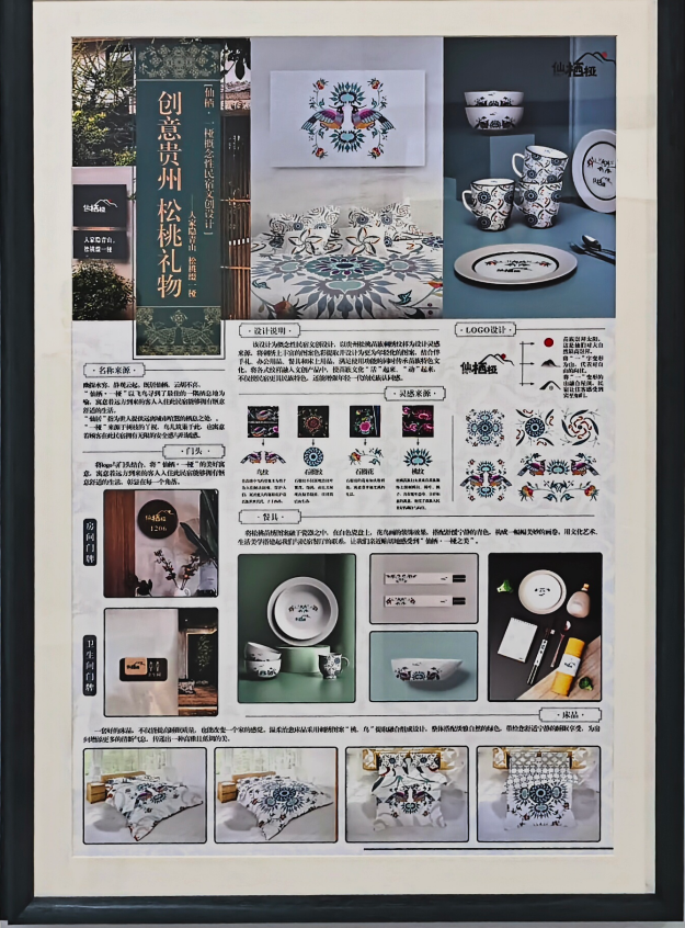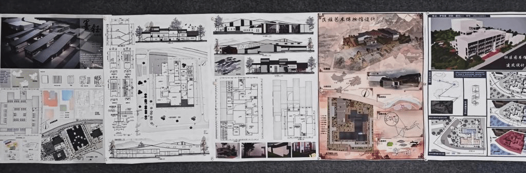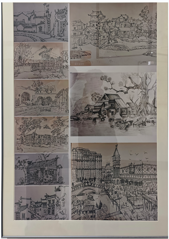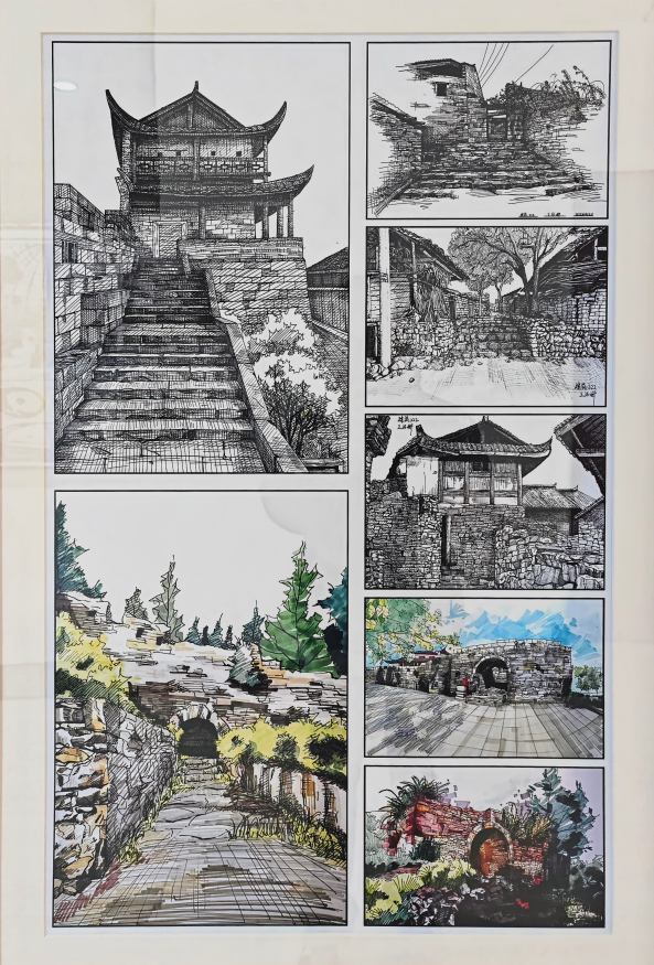 学院2-4楼三个楼层的楼道文化建设,分别充分体现了“人文地理与城乡规划专业教学科研空间”“建筑学专业教学科研空间”“环境设计专业教学科研空间”各自的文化特色。按照“经典作品+师生作品+学生习作”三个模块,学院精心选择、优中选优确定了陈列作品。走进三个楼层,专业特色浓郁、艺术感强烈的作品次第跃入眼帘,建筑大师梁思成的“应县木塔”结构图,学院多名教师的精品力作,卢盛凯同学、丁成丹同学及部分学生团队的建筑设计作品、平面设计获奖作品、文创设计获奖作品等获奖作品让人眼前一亮。“锦屏隆里古城建筑测绘图”、“联合国教科文组织授奖的松桃县文创作品”、“阳明文化设计作品”及富含美感的学生专业习作......琳琅满目,新风徐来。
