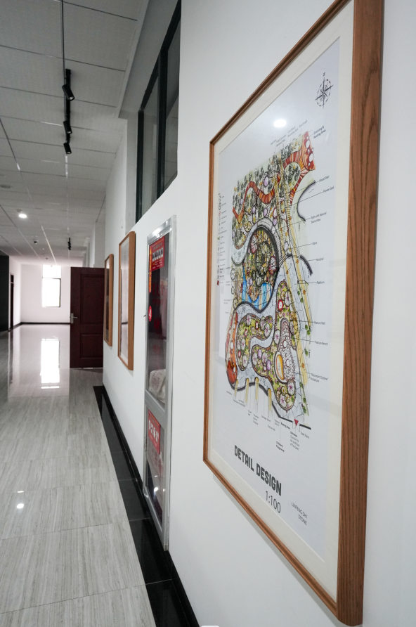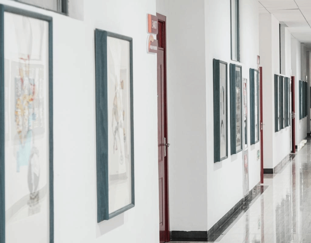 建设理念和思路确定后,学院师生群策群力,合力创建楼道文化精品。人文地理与城乡规划、环境设计、建筑学三个专业分别组织本专业师生贡献智慧与设计作品,经过三个专业的精心挑选,学院最终确定了53幅画作或设计作品作为陈列作品。并在充分尊重专业教师意见的基础上,分别按现代简约、中式古典、欧式古典三个种类确定了画框风格。学院精心选择具有专业艺术展陈布展经验的装裱企业,采用了美术馆级的画框材料。同时,又专门制作25面金属板磁吸展墙用于即时陈列布置学生优秀习作。经过近两个月的作品选择、装裱、悬挂,12月2日,学院教学区2-4楼文化陈列终于绚丽绽放。