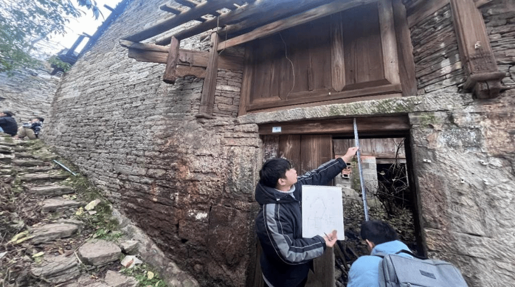 屯堡建筑测绘过程中,学生们在王东老师和助教的指导下,熟练使用测绘工具,从实地勘测到数据记录,再到数据整理与图纸绘制。除了测绘工作,学生们还通过与当地村民的交流,深入了解到了屯堡建筑形成的历史和背后的故事,沉浸式体验其深厚的屯戍边疆的爱国主要精神。村民告诉同学们,屯堡建筑独特的建筑形制与明代屯军的防御需求有关直接关联,听了这些故事后同学们对屯堡建筑“另眼相看”。
