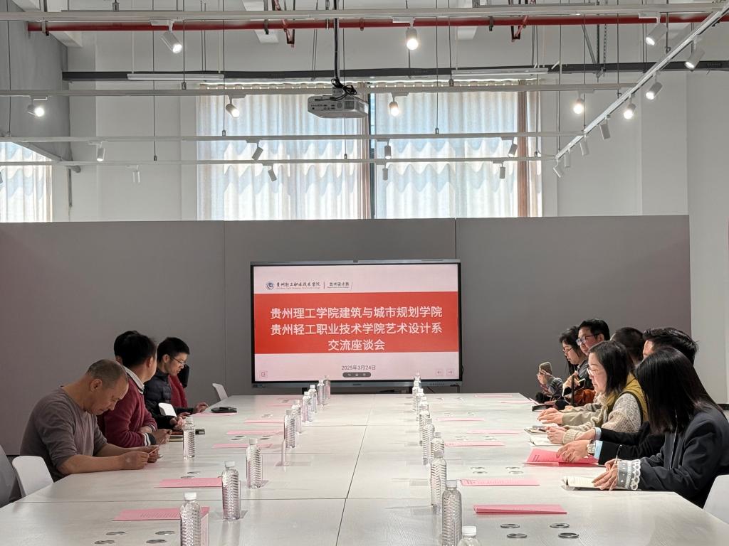 3月24日下午,建筑与城市规划学院前往贵州轻工职业技术学院艺术设计系调研,双方组织了一场富有成效的交流活动,旨在加强校际间的合作沟通,共同推动艺术类专业发展和人才培养。我院领导班子全体成员、环境设计专业教研室全体教师参加调研交流活动。