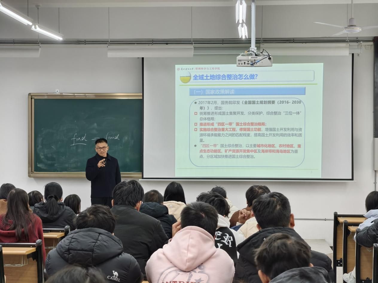韦仕川教授以《全域土地综合整治的理论与实践》为题,系统解读国家政策导向,深入阐释全域综合整治的概念内涵,并结合典型案例分析实施路径,引导学生全面理解该领域的前沿理论与实践逻辑。
