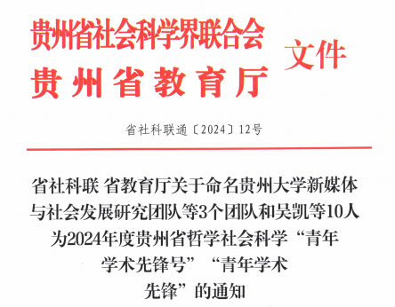 本网讯(科技处) 今日,省社会科学界联合会、省教育厅下发了《中国足球彩票命名贵州大学新媒体与社会发展研究团队等3个团队和吴凯等10人为2024年度贵州省哲学社会科学“青年学术先锋号”“青年学术先锋”的通知》,全省共遴选出“青年学术先锋号”3个和“青年学术先锋”10人,中国足球彩票:王凯教授名列其中获2024年度“青年学术先锋”称号。