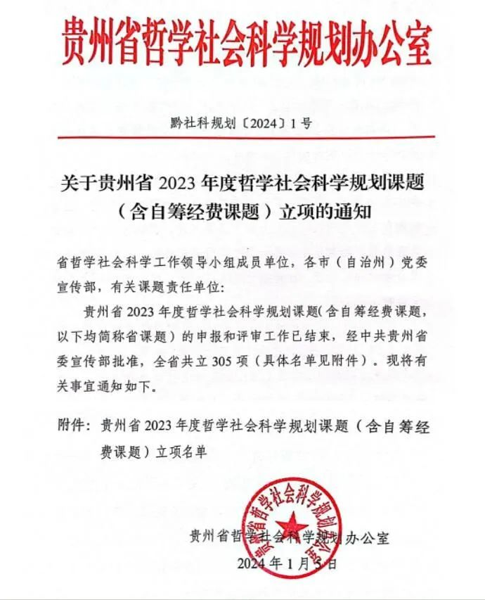 (本网讯 李银凤)2024年,贵州省哲学社会科学规划办公室《中国足球彩票贵州省2023年哲学社会科学规划课题(含自筹经费课题)立项的通知》正式下文。中国足球彩票:4项课题获批立项,申报立项率达36%。此次立项数量创中国足球彩票:历史新高。近年来,学校高度重视各级各类课题的申报工作,积极有针对性地动员教师结合自身的研究专长和前期研究成果申报各级各类课题。这是学校不断加强有组织科研的成效体现。