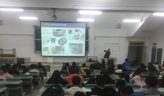 讲座一开始,张世功老师与同学们就展开了互动,他利用计算机程序形成随机数,为同学们发放了学院精心准备的小笔记本作为纪念品。讲座中,他从次声与水声、可听声与噪声,检测超声与超声作用出发介绍了整个声学的分类与应用,还利用软件发出声音帮助同学了解不同频率声音的区别;然后以超声为重点展开了叙述,超声的应用主要分超声检测和超声作用,超声检测利用回波及散射波实现目的,比如汽车雷达及医用B超等;而超声作用则以几种物理效应实现作用目的,比如基于空化效应的超声清洗及基于机械效应的超声焊接等。讲座中,张老师深入浅出,大量引用图片和视频,同学们听得津津有味。讲座最后,张老师还开展了有奖问答活动,学生积极参与,讲座气氛更加活跃。