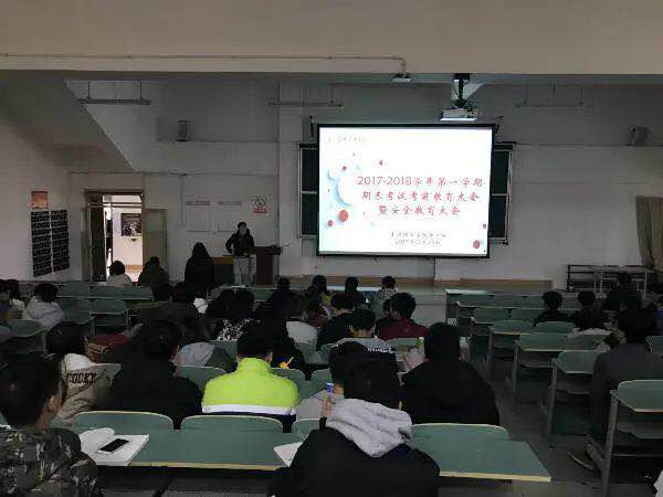 (理学院统计172班 李航 报道)临近期末,为进一步严肃考风考纪,杜绝考试作弊现象的发生,提高大学生安全防范意识,理学院于12月25日上午10时在三教416阶梯教室召开“2017—2018学年第一学期期末考试考前教育大会暨安全教育大会”,大会由我院党总支副书记袁小松主持,执行院长张民选、副院长李智玲、辅导员王姣、张梦以及我院2017级全体学生参加本次大会。