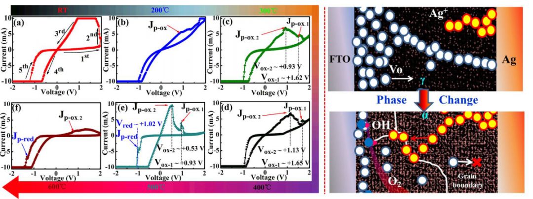 (器件结构Ag|Fe2O3|F-doped SnO2 中观测到的忆阻现象和长期以来被隐藏的氧化还原过程实验结果图以及氧空位(Vo)、Ag+ 和空气中水分子界面分解后在晶界处的迁移物理机制图)