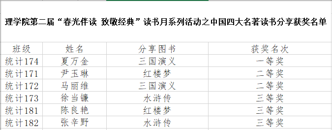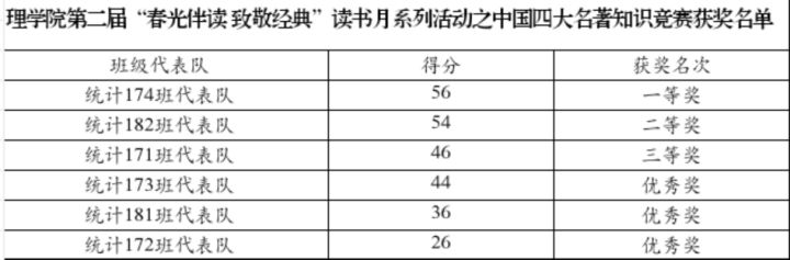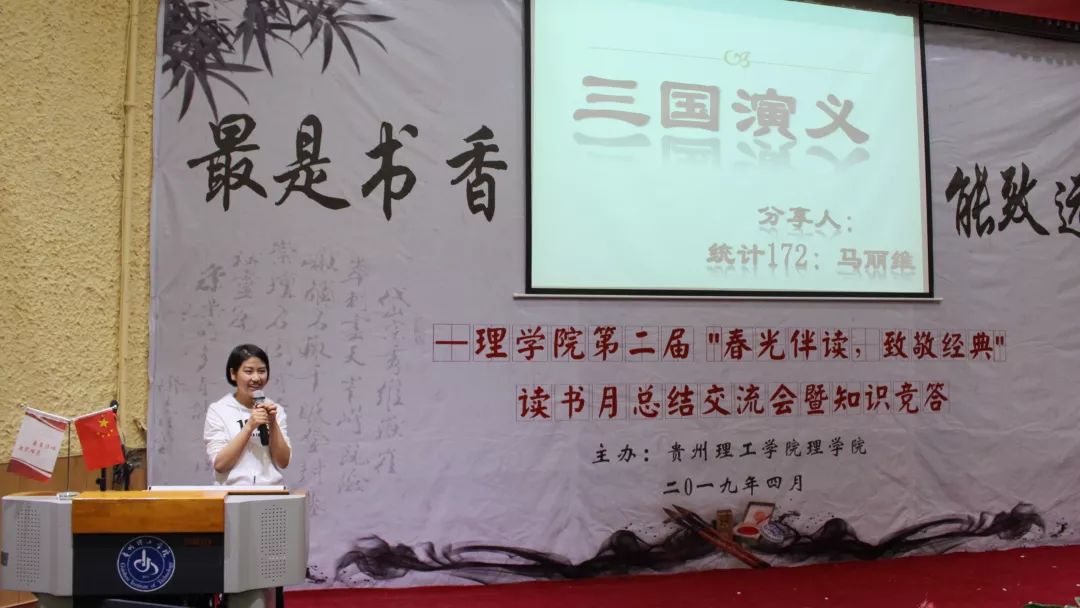 理学院为打造浓郁书香校园,推进学院学风建设,提升学院通识教育水平,引导全院学生"爱读书、读好书、善读书”,秉承全员参与、内容充实、积极创新、持之以恒的原则,理学院于2019年4月24日晚上7: 30在逸夫小报告厅举行了“最是书香能致远”——理学院第二届“春光伴读致敬经典”读书月系列活动之中国“四大名著”交流总结会暨知识竞赛。