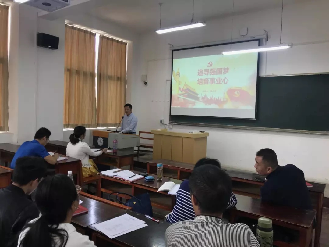 党日活动中,理学院党总支书记袁小松同志以“庆祝新中国成立七十周年,传承红色革命精神”为主题为大家上了一场生动且别开生面的党课。党课以《追寻强国梦,培育事业心》为题,他从介绍自己的家乡—红色革命圣地--土城开始,分析了我们党在四渡赤水时的军民鱼水情,他还分享了2018年暑假到延安学习培训的心得,介绍了习近平总书记当年在梁家河度过的跳蚤关、饮食关、生活关、劳动关、思想关五大关,分析了他“为人民谋幸福 ”的初心。袁小松书记通过比较习近平总书记当时工作环境与目前学校的教学环境,分析了目前学校在迎接教育评估存在的软硬件困难与问题,他强调,大家要艰苦奋斗,努力工作,为响当当通过教育部本科教学工作合格评估做出自己的贡献。