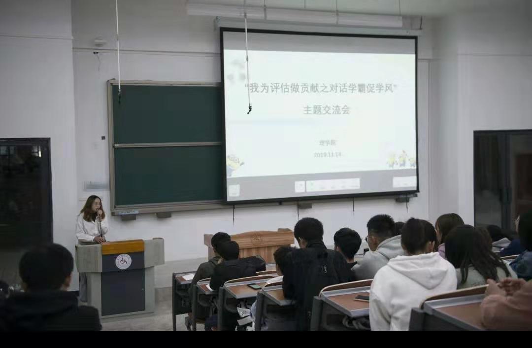 为了加强学院学风建设,营造优良学风,树立学习榜样,激励和促进同学们养成良好的学习习惯,加强自我要求和提升个人综合素质的能力。理学院学生会于11月14日18时在开物楼G1109教室组织开展“我为评估做贡献之对话学霸促学风”主题交流会,理学院2017级优秀学生代表及2018、2019级学生参加了此次交流活动。