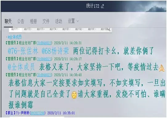 这时你才会发现,这个“甲”,居然是理学院统计172班的班主任刘广群老师。在这个疫情笼罩下的统计172班QQ群里,没有恐慌,没有阴暗,却随时充满着阳光、幽默与乐观的气息。