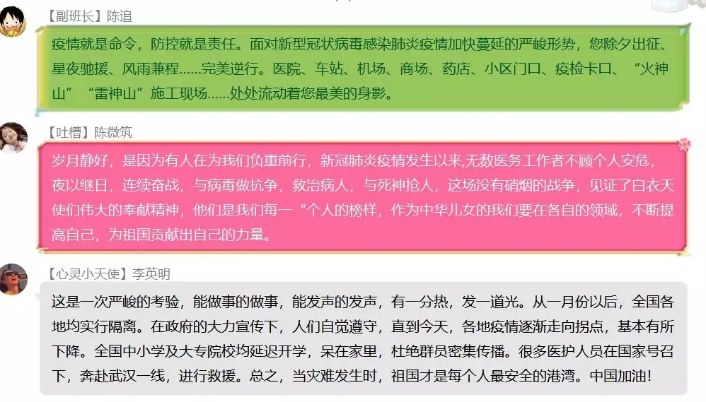 还有很多同学的发言及分享,限于篇幅,不能一一摘录,但是,同学们激情洋溢、饱含深情的叙述和分享感人肺腑,催人奋进。面对疫情,同学们能够树立家国情怀,认识国家精神,正确理性地对待疫情,服从学校的防控工作安排,积极承担防疫责任、履行防疫义务,体现了新时代大学生的使命与担当。