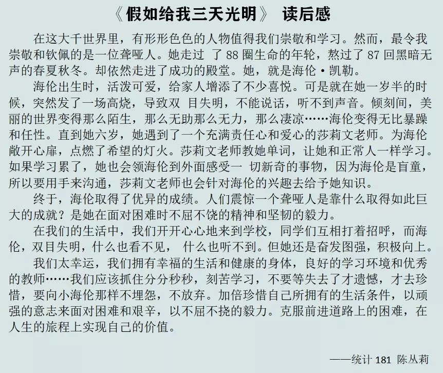 由于疫情的影响同学们不能如期开学,在班、团干的倡导下,大家呆在家中除了网上学习外,还积极去品读一本好书,分享人生感悟,让经典传承哺育胸怀。以下是陈丛莉同学分享的读书心得: