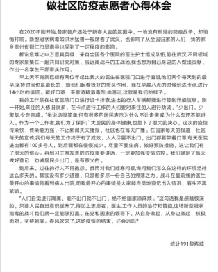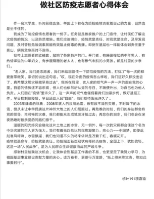 此次志愿服务的经历让我深刻体会到“纸上得来终觉浅,绝知此事要躬行”这句话的深刻含义。这场没有硝烟的战争中,没有一个局外人,没有一个旁观者,身为一名大学生并且还是一名共青团员,我们应该学会服从、付出并对身边的一切充满热情。在这样的特殊时期做志愿者,让我得到了许多在学校里所体会不到的特殊体验和人生感悟,我很庆幸能够参加到其中。而抗疫过程中,人们出门都自觉的戴上口罩,尽量待在家里不外出,全国上下都团结起来,为打赢这场抗疫战而做着自己力所能及的事,我相信在每一份善意的努力下,温暖日定会早早到来。 ——统计191高茜婷