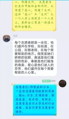 志愿者服务的经历会对其人生产生了重大的影响吧,作为在学校里的学生、作为在社会里的个人,我们也应该学会服从、付出、充满热情。青年志愿者活动是倡导团结友爱、助人为乐、见义勇为的社会风气,是当代社会中一项十分高尚的事业。体现了中华民族助人为乐、扶贫济困的传统美德,是大有希望的事业。这是当代大学生的行动指南,是当代青年志愿者的使命,也是我们学习“三个代表”的具体体现。