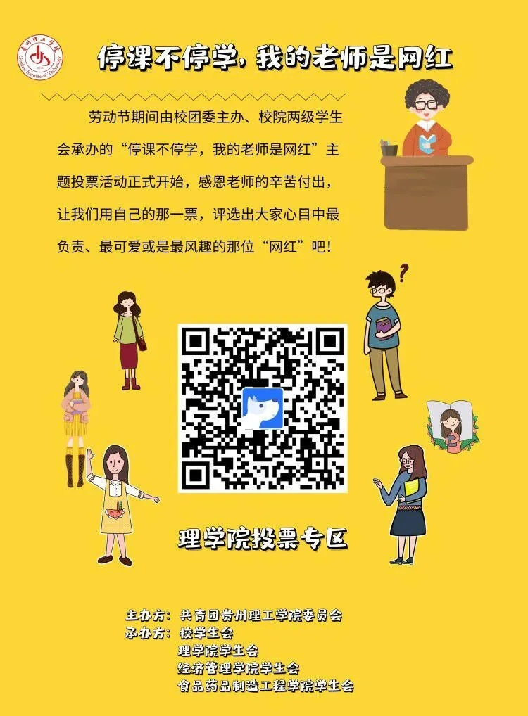 就此在劳动节期间由校团委主办、校院两级学生会承办的“停课不停学,我的老师是网红”主题投票活动正式开始,感恩老师的辛苦付出,让我们用自己的那一票,评选出大家心目中最负责、最可爱或是最风趣的那位“网红”吧!