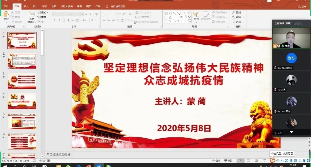 “没有一个冬天不可逾越,没有一个春天不可到来”。随着短片《加油,我的国》坚定理想信念,理学院2020年春季“道德讲堂”于5月8日晚20时在腾讯会议直播开讲,这次道德讲堂的主讲老师是学院党总支副书记蒙蔺老师,2019级全体学生参与。