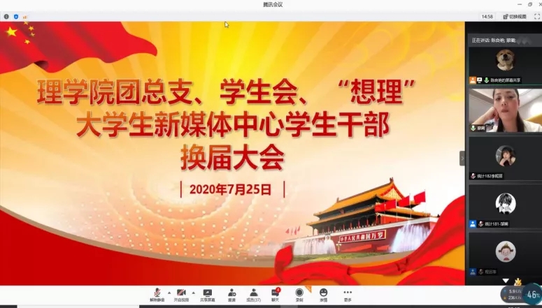 为进一步加强我院学生干部队伍建设,使学生会可持续发展,7月26日晚8点,我院以线上会议的形式召开了学生干部的换届大会。本次会议由理学院学生会主席陈良艳同学主持,参会的有理学院党总支副书记蒙蔺老师、理学院辅导员王姣老师、张梦老师、程远菲老师以及理学院全体学生会干部。