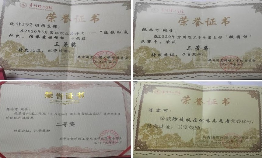 学习上积极认对待各类课程,踏实努力完成科任老师习题及测试,大一综测班级排名前十五,年级排名前三十。2020年荣获“贵州理工学院第二届信息可视化大赛”动态组三等奖。