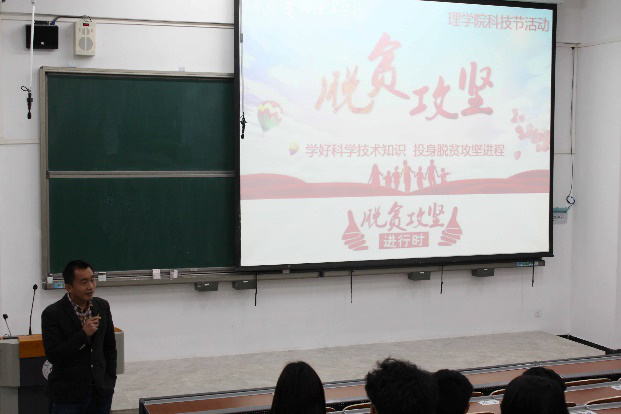 为更好培育学生科技意识,凝聚全院师生力量,助力打赢脱贫攻坚战,2020年11月10日晚上20:30,理学院在天工楼G1209教室开展了“脱贫攻坚--学好科学技术知识,投身脱贫攻坚进程”理学院2020年“科技活动周”科技讲座。本次讲座由理学院党总支副书记蒙蔺老师主持。理学院教室党支部书记张世功老师担任此次讲座的主讲人,参加此次讲座的有理学院全体2020级新生以及部分高年级学生。