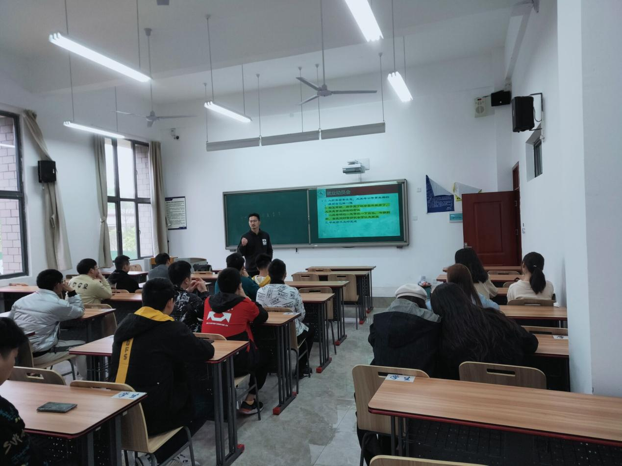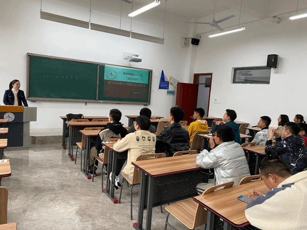 本网讯(理学院 戴登鸾/图文)理学院统计172班就业动员会于4月8日贵安校区G2101举行,理学院党总支副书记蒙蔺、统计172班班主任刘广群参加本次动员会。本次动员会旨在提升统计172班学生就业积极性,提升同学门在找工作时的防诈骗意识,提醒同学们注意审视自身考研考公需谨慎,倡导同学间互相帮助就业,倡导先就业再择业考公考研,最后提醒同学们毕业论文设计须及时完成。