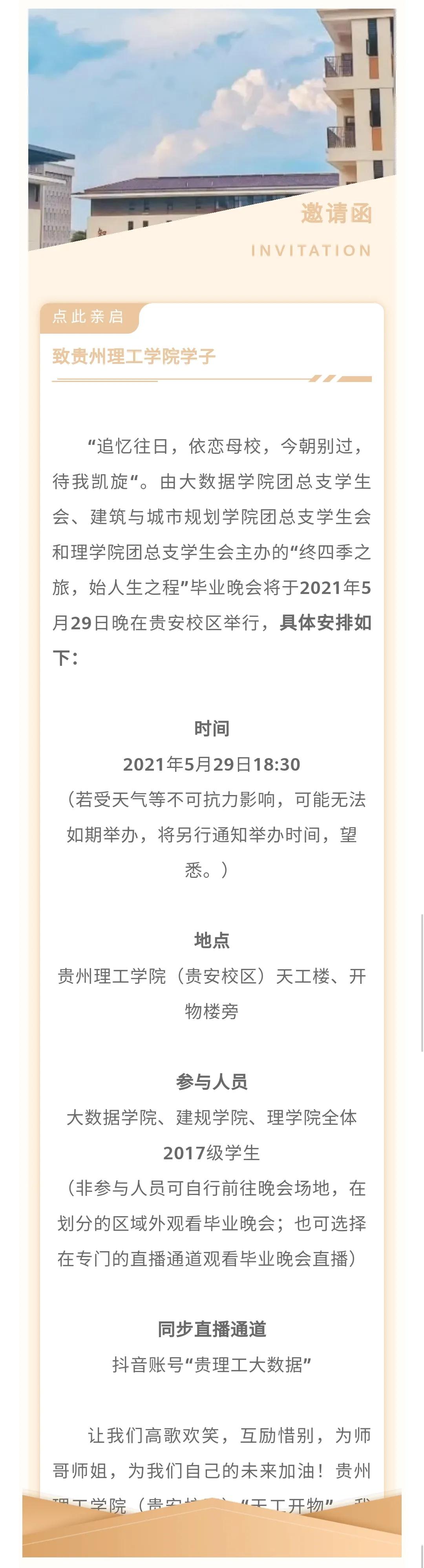又是一年毕业季,大数据学院、建筑与城市规划学院、理学院诚邀各位理工师生共赴2017级学子的“终四季之旅,始人生之程”毕业主题晚会。下为“贵理工贵安校区2017级毕业晚会共赴笺”,愿君阅之。