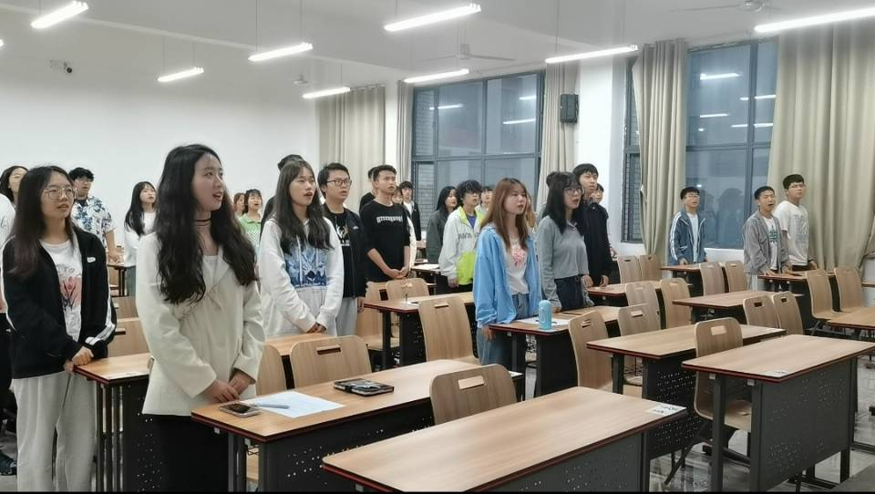 会上,潘敏英同学首先组织全体同学面向团徽,奏唱团歌,共同感受着青春的激扬,随后为同学们讲解了中国共产主义青年团团徽以及团徽团旗的使用说明,团徽中带有团旗、齿轮、麦穗、初升的太阳及其光芒,写有“中国共青团”五个字的绶带。它象征了中国青年一代继承中国人民的革命传统,永远忠于祖国和人民,做一个朝气蓬勃、奋发向上的青年,我们应该中国共产主义青年团成立100周年致以青春的礼赞。