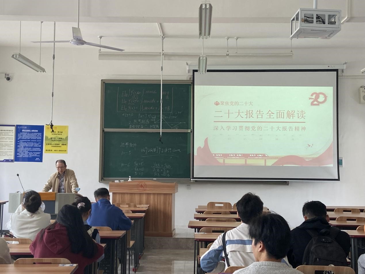 2022年11月9日,理学院党总支书记黄念庆为理学院2019级全体同学主讲了“深入学习党的二十大精神”宣讲会,会上,黄书记对二十大报告进行全面解读,以质朴的语言带领学生一起深入学习贯彻党的二十大精神。