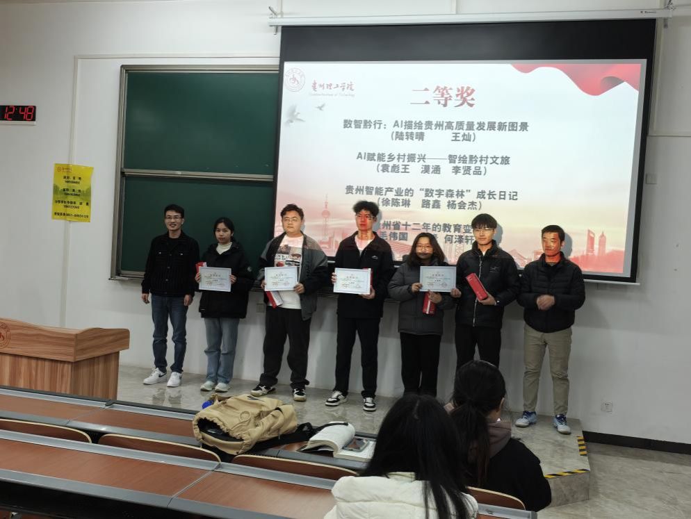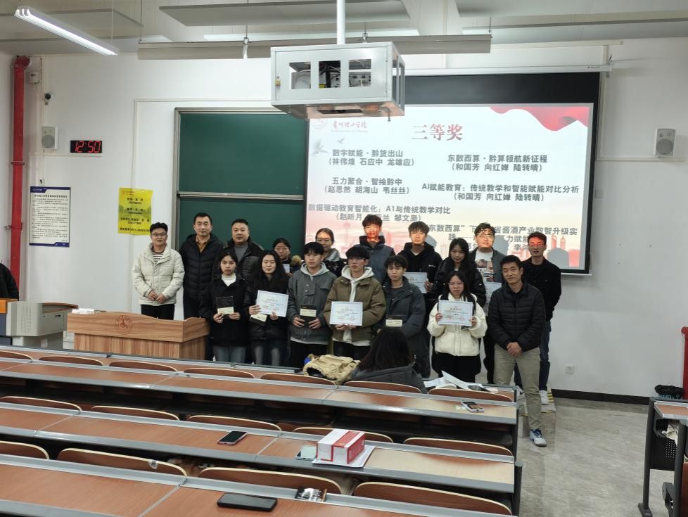 2025年12月9日,理学院在天工楼G2117教室举行贵州理工学院第七届统计信息可视化大赛颁奖典礼,理学院党总支书记周新国、副院长张世功、张豹老师出席并给获奖队伍颁奖。